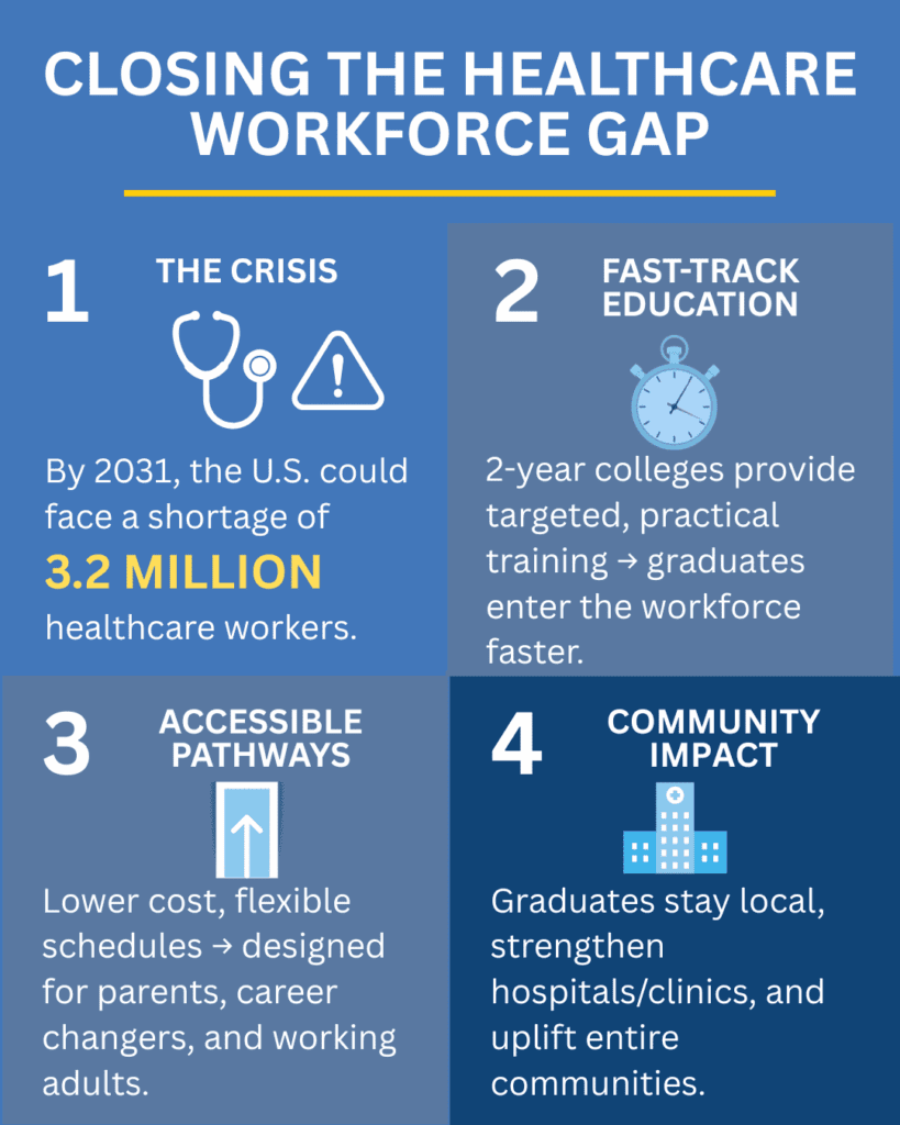 By 2031, the U.S. is projected to face a shortage of up to 3.2 million healthcare workers. While the number is staggering, it also represents an opportunity—one that two-year health career colleges are uniquely equipped to meet.